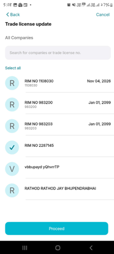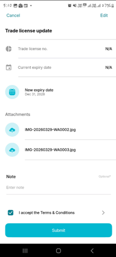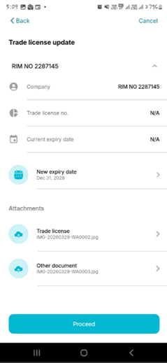 - Insert the “new expire date(s)” and “upload the updated trade licence”.